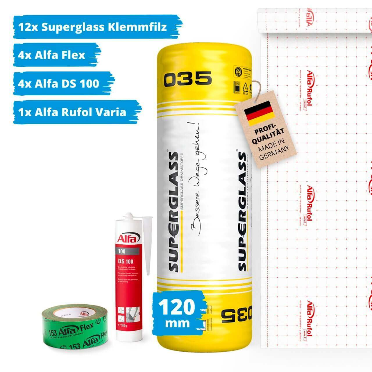 Superglass Klemmfilz 120 mm Set für 60 m² Dachausbau Paket Komplettset Dämmung Dach Dachdämmung Dachausbau Dachrenovierung