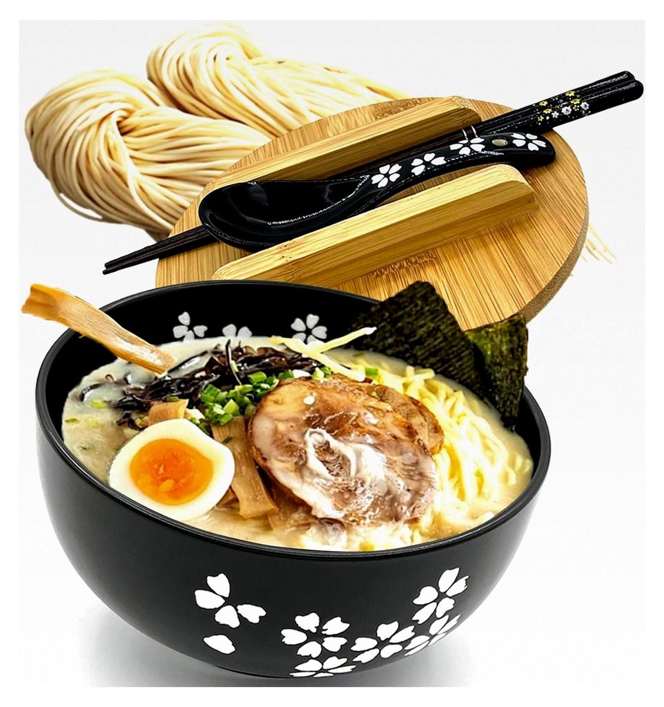 Keramik Ramen Schüssel Set - Schale mit Deckel, Essstäbchen und Suppenlöffel, Asiatisches Geschirr für Pho, Salat und Müsli, Schwarz