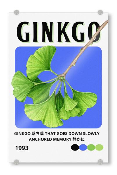 Acrylglasbild "Ginkgo leaves" artboxONE - Floral,Abstrakt - Ginkgo,Leaves,Green,Blue,Japanese,Text,Color swatches,1993,Nature,Botanical.