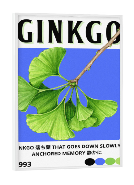 Poster mit weißem Rahmen "Ginkgo leaves" artboxONE - Floral,Abstrakt - Ginkgo,Leaves,Green,Blue,Japanese,Text,Color swatches,1993,Nature,Botanical.