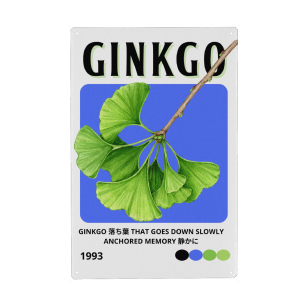 Metall Poster "Ginkgo leaves" artboxONE - Floral,Abstrakt - Ginkgo,Leaves,Green,Blue,Japanese,Text,Color swatches,1993,Nature,Botanical.