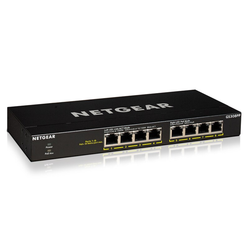 NETGEAR 8-Port Gigabit Ethernet Unmanaged Essentials PoE+ Switch (GS308PP): mit 8 x PoE+ bei 83 W, Desktop- oder Wandbefestigung