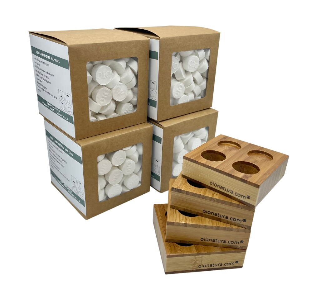 OIO NATURA Komprimierte biologisch abbaubare Tücher von OIO (Packung mit 800 Stück) + 4 Bambussockel Duo