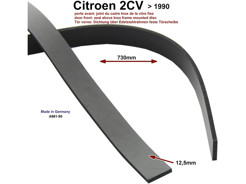 2CV, Türscheibe vorne, oben. Dichtung oben auf dem Edelstahlrahmen in der Tür, für die starre, obere Türscheibe. Länge: 730mm. Breite: 12,5mm