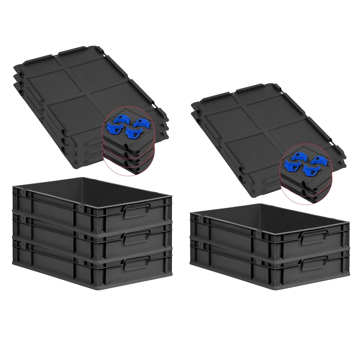 PROREGAL SparSet 5x Eurobox NextGen Grip mit Auflagedeckel & 4 blauen Verschlüssen, HxBxT 12x40x60cm, 23L, Schwarz, Griffe zu, Eurobehälter