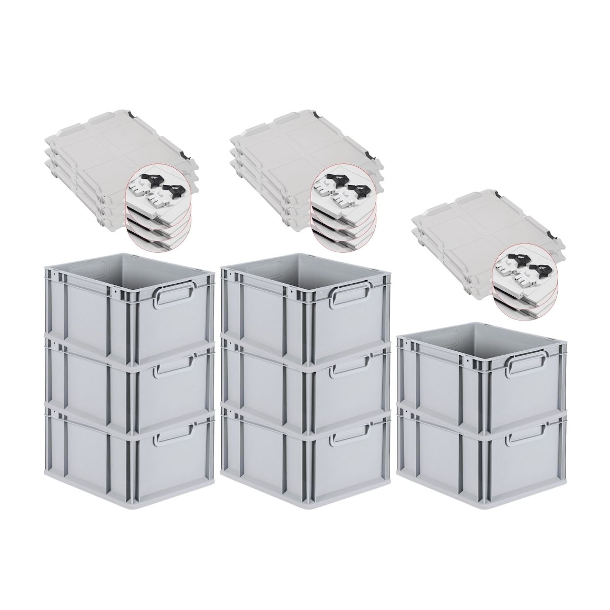 PROREGAL 8x Eurobox NextGen Grip mit Scharnierdeckel & schwarzen Verschlüssen | HxBxT 22x30x40cm | 20 Liter | Griffe geschlossen | Glatter Boden