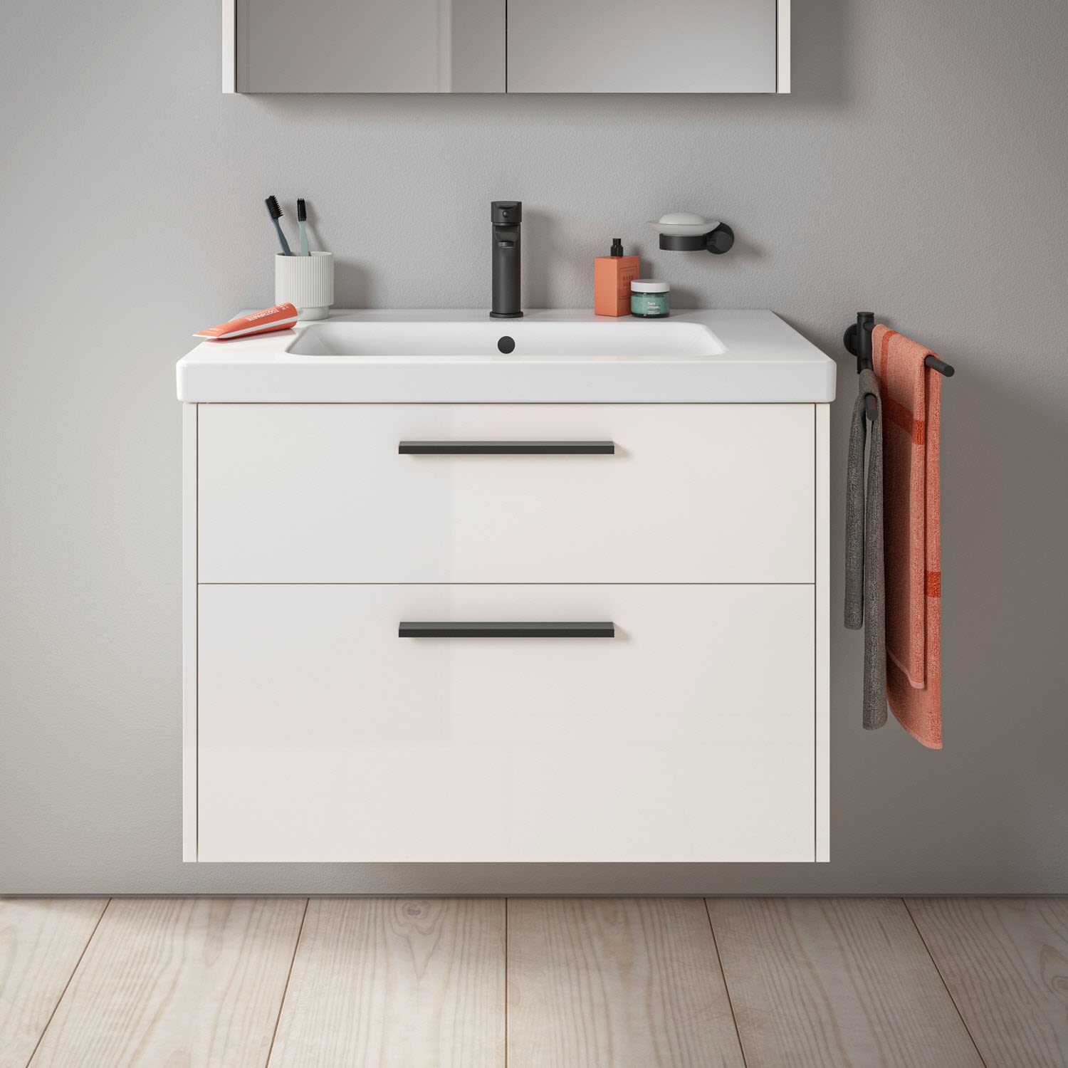 Duravit D-Code Waschtischunterschrank 80 cm mit Keramikwaschtisch, mit 2 Auszügen, Griff schwarz, Badmöbel,