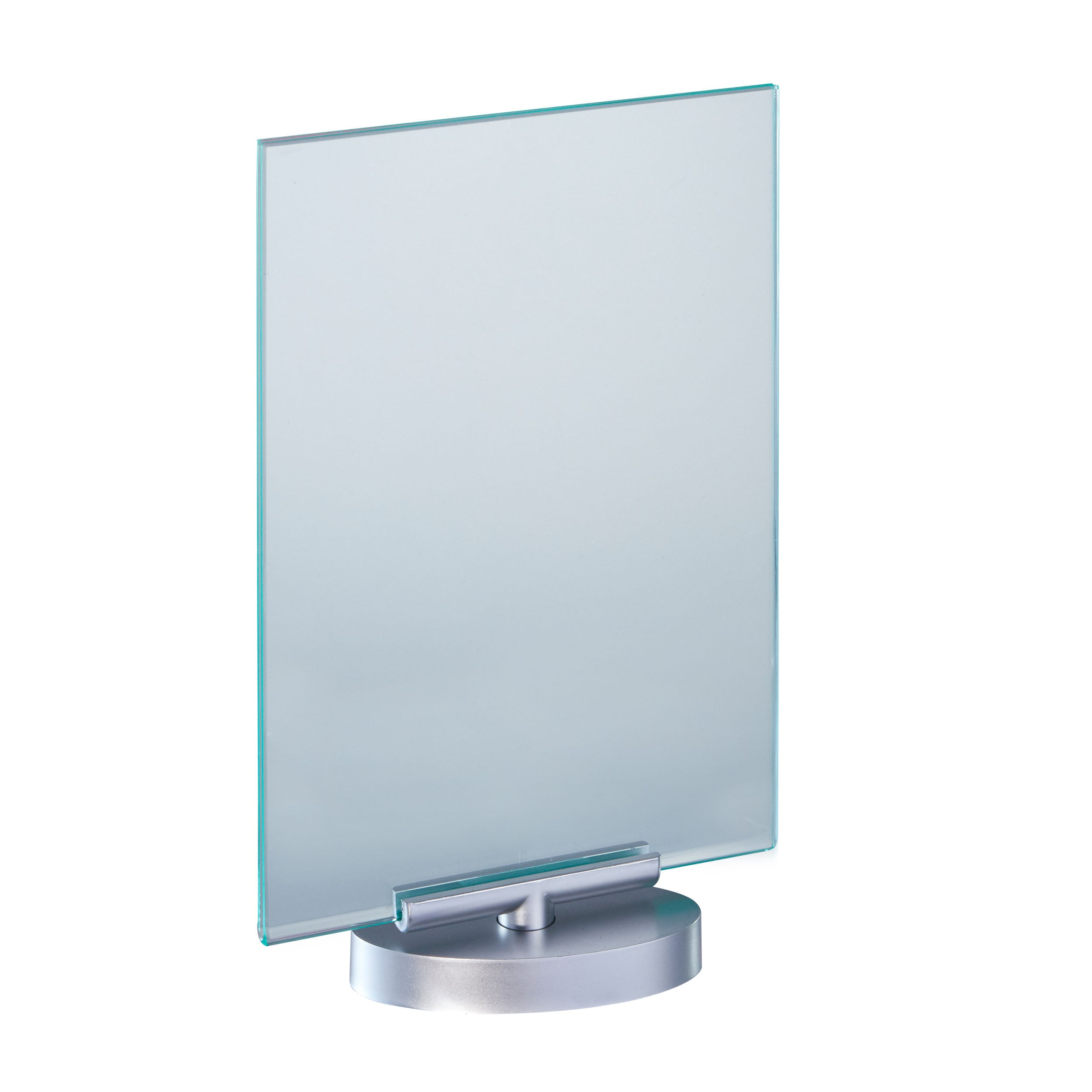 T-Aufsteller A5, drehbar, mit Acryl im Glaslook und Sockel A5, Acryl (PMMA), transparent|silber
