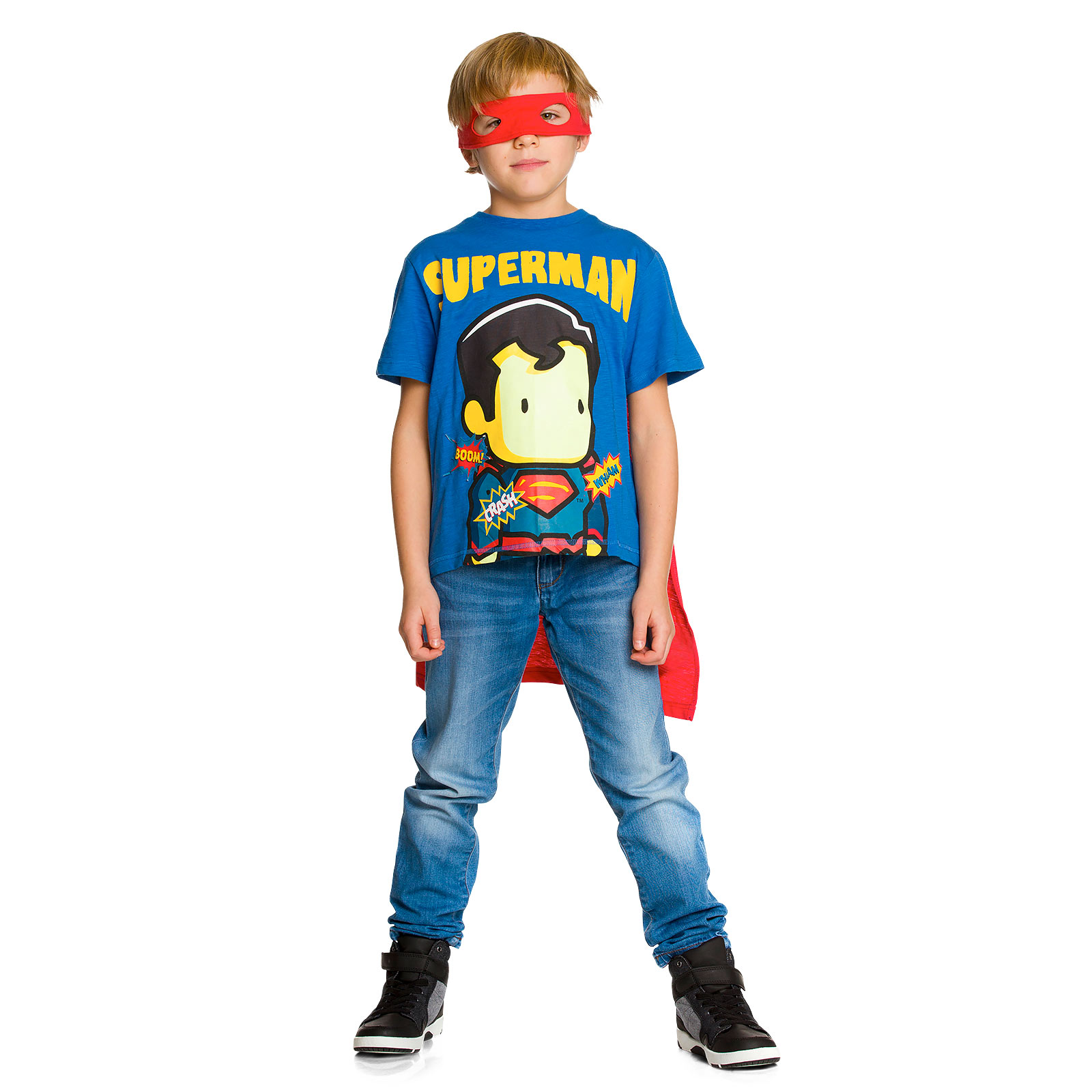 Superman - T-shirt per bambini con mantello e maschera per gli occhi - 152 - Blu,Rosso
