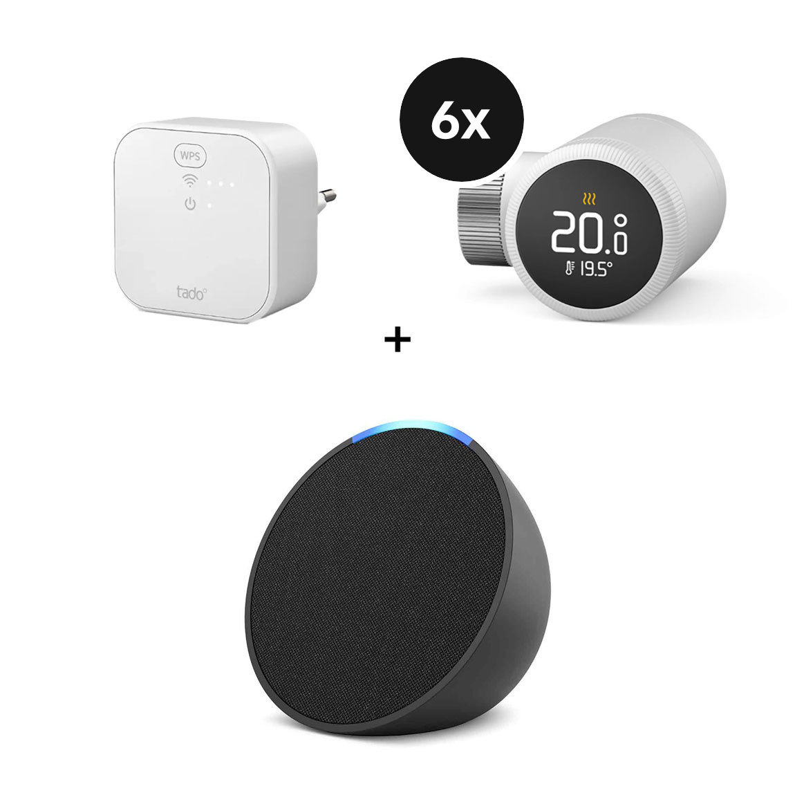 tado° X Starter Kit Smartes Heizkörper-Thermostat - 6er-Set + Bridge + Amazon Echo Pop - Neueste Generation