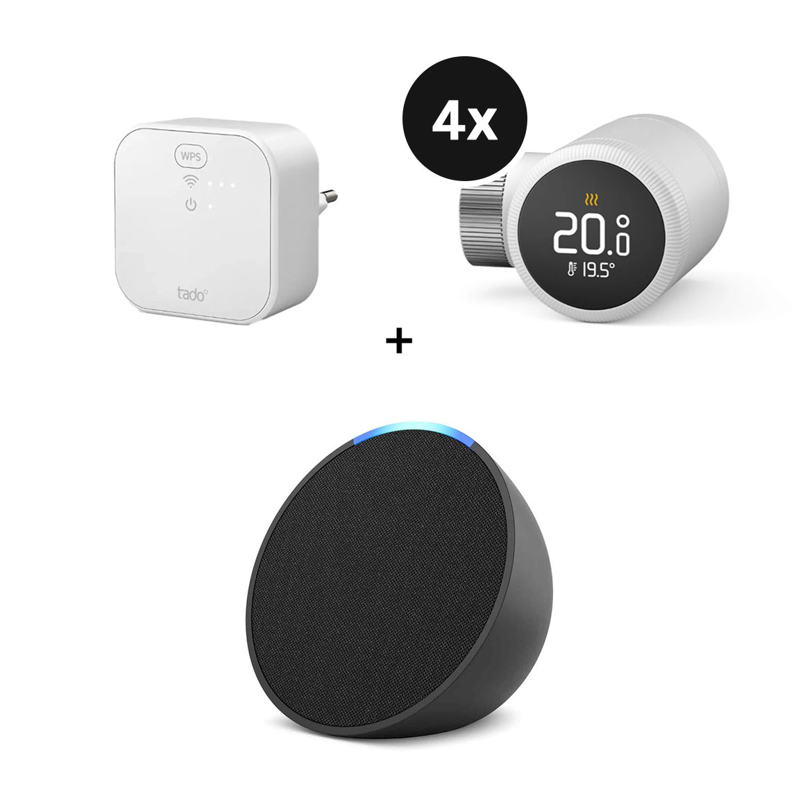 tado° X Starter Kit Smartes Heizkörper-Thermostat - 4er-Set + Bridge + Amazon Echo Pop - Neueste Generation