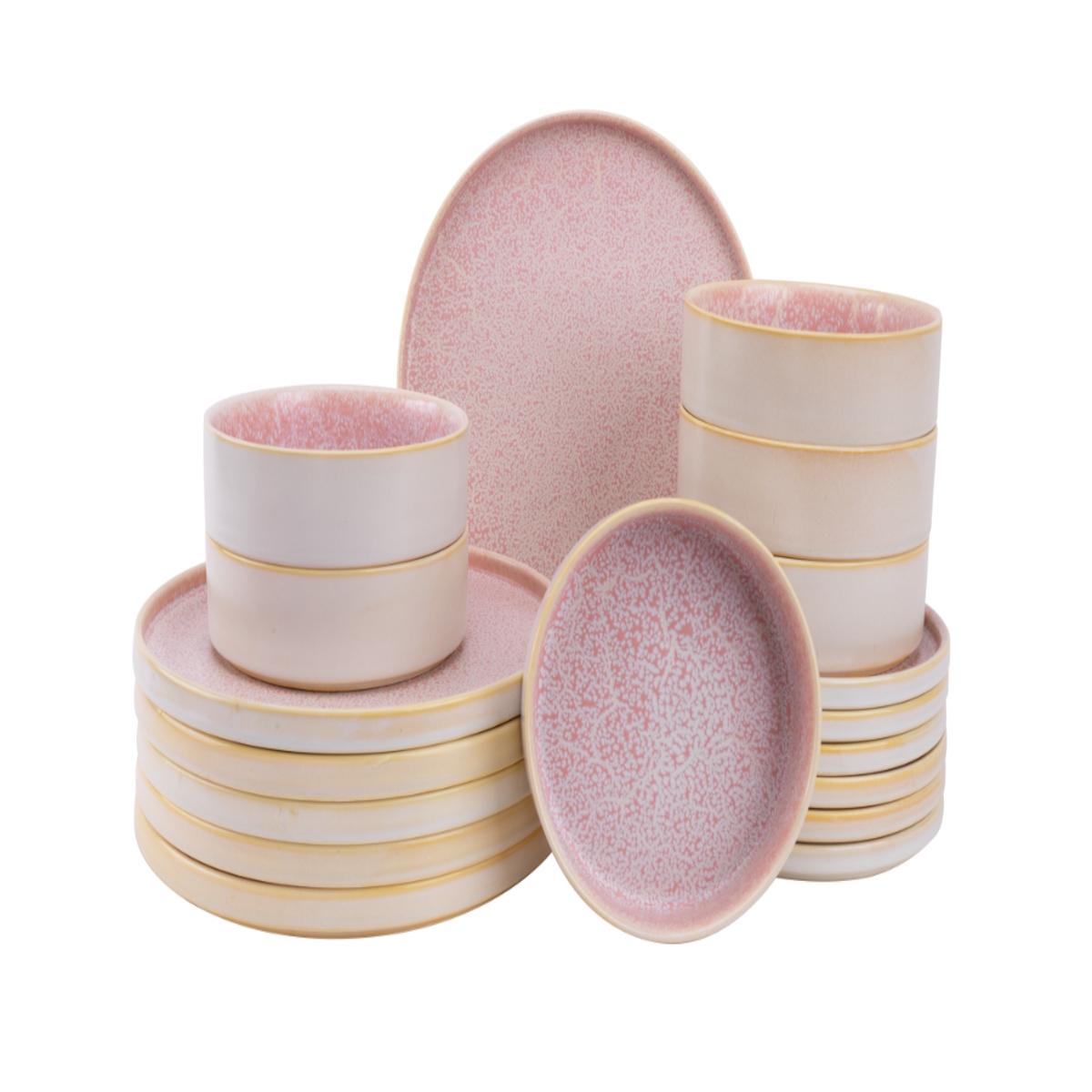 MALACASA, 12 tlg. Steingut Geschirrset Kombiservice Tafelservice mit je 4 Speiseteller, Dessertteller, Schale, pink & khaki