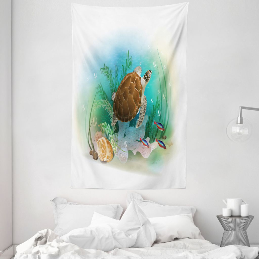 ABAKUHAUS Wasser Wandteppich und Tagesdecke, Tropen Schildkröte Aquarium aus Weiches Mikrofaser Stoff Waschbar ohne Verblassen Digitaldruck, 140 x...