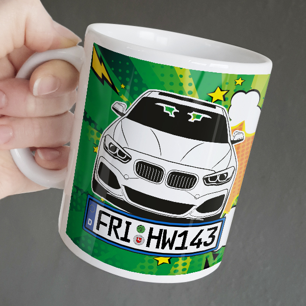 Originelle Kaffeetasse mit Kennzeichen, Auto oder eigenem Bild. Tasse bedrucken lassen bei auto4style. Tassen mit Gesicht als Fototassen mit Namen...