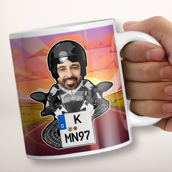 Personalisierte Tasse Motorradfahrer Comic mit Kennzeichen – Tasse Comic Motorrad – Einzigartiges Geschenk für Motorradfahrer – Jetzt personalisieren!