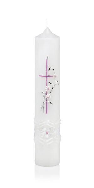 Taufkerze Mädchen "Rosa Kreuz mit Blüten" 265 x Ø 50 mm mit Namensverzierung