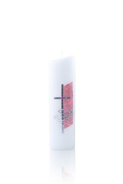 Taufkerze Mädchen "Kreuz mit Fischen" Rosa/Silber 265 x Ø 50 mm mit Namensverzierung