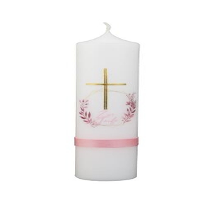 Taufkerze für Mädchen "Kreuz, Fisch und Anker" und rosa Schleife 400 x Ø 40 mm mit individueller Namensverzierung aus Wachsbuchstaben