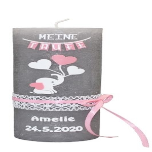 Taufkerze Mädchen Rustic Elefant 190 x 68 mm mit individueller Namensverzierung aus hochwertigen Wachsbuchstaben und Sichtkarton