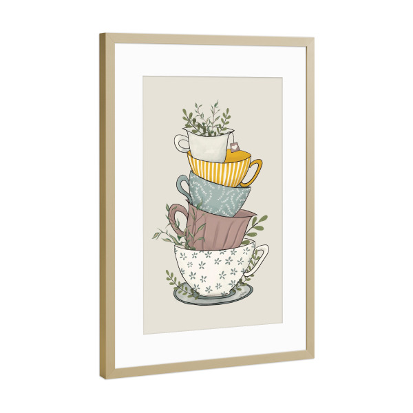 Poster mit Rahmen Gold "Tassenstapel.jpg" artboxONE - Essen & Trinken - Teacups,Tassen,Geschirr,Illustration,Küche,Tee,Tea,Mugs,Bunt,Colorful