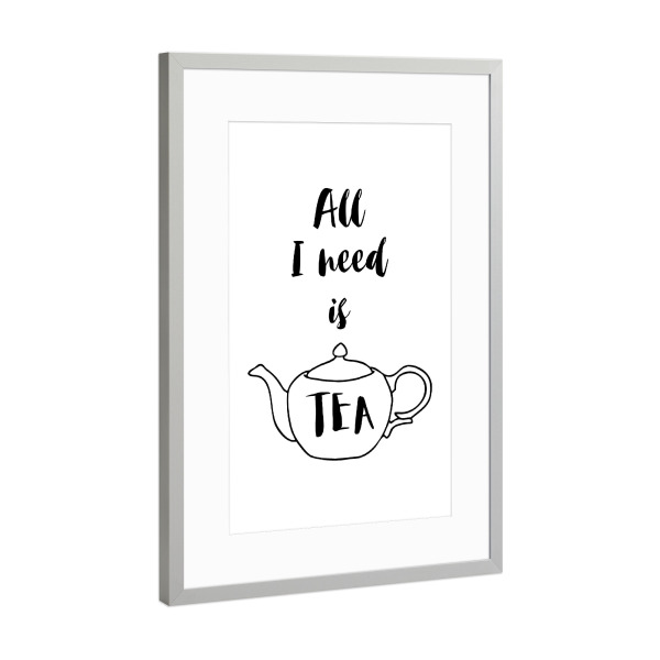 Poster mit Rahmen Silber "All I need is Tea" artboxONE - Typografie,Essen & Trinken,Schwarzweiß - Tea,Tea lover,Tea addict,Tea quotes,Teapot