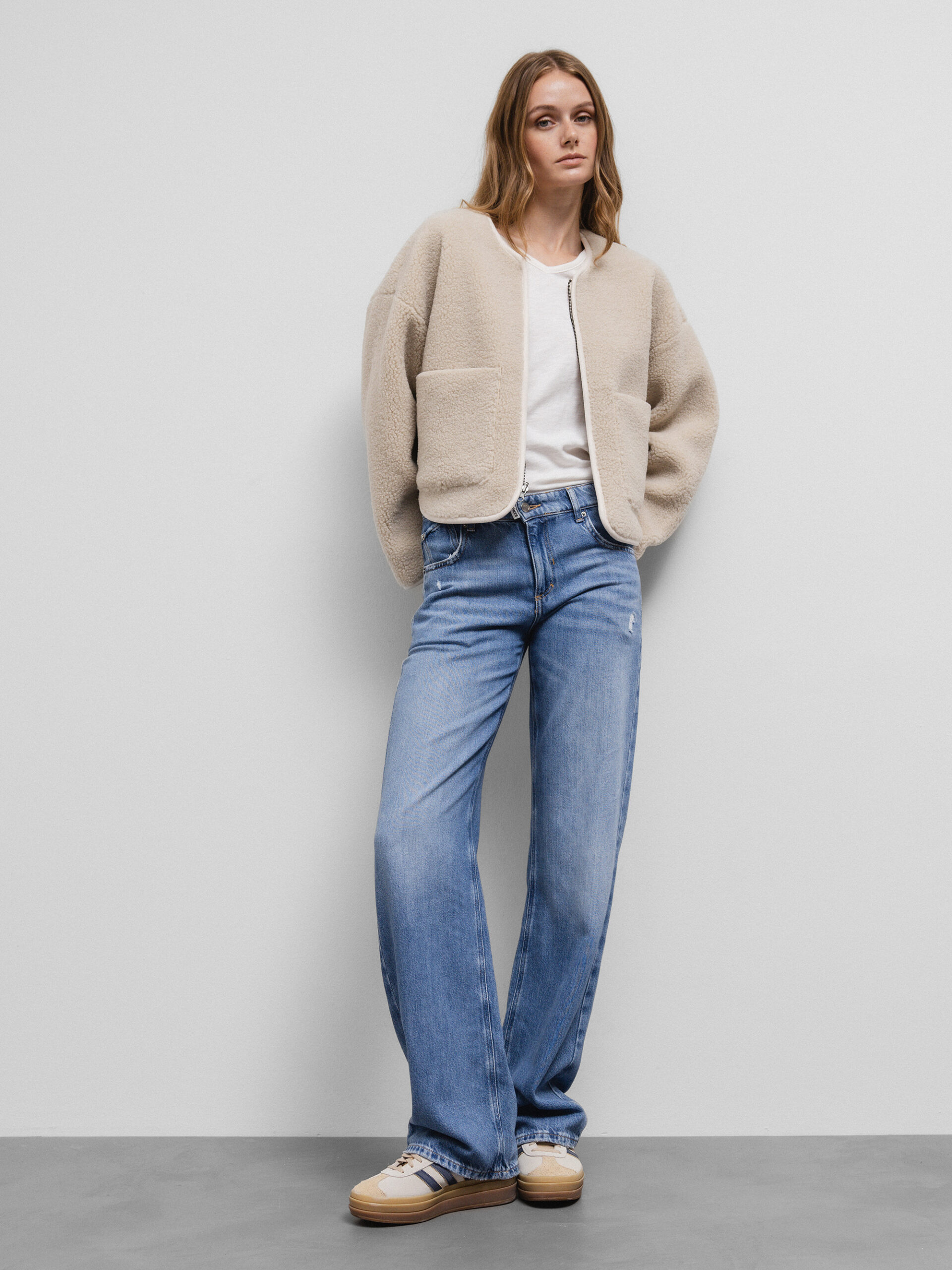 OXMO OXTova Damen Sweatjacke Lang Jacke mit Teddy-Fell Stehkragen Reißverschluss Eingrifftaschen Loose fit