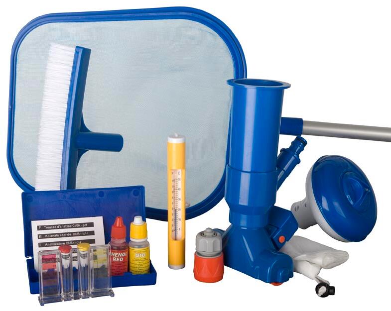 Gre Pool Reinigungsset, Vakuum-Bodensauger, Poolbürste, Kescher, Teleskopstange, weiß blau