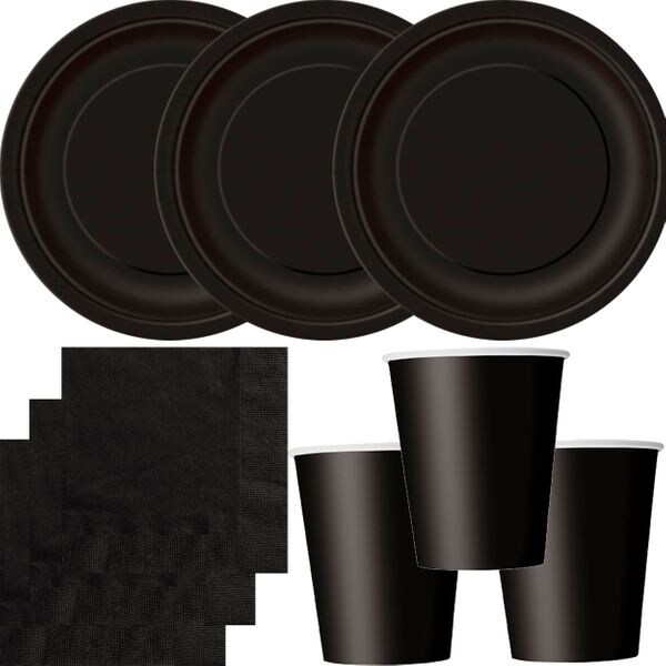 Party Deko Set Schwarz Einweggeschirr für 16 Personen Teller, Becher, Servietten