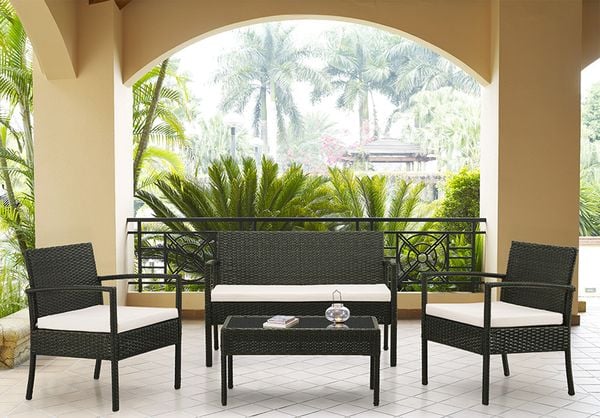 4-teiliges Terrassenmöbel-Set aus Korbgeflecht mit robustem verzinktem Metallrahmen, Outdoor-Sitzgruppe mit Kaffeetisch aus gehärtetem Glas, Schwarz