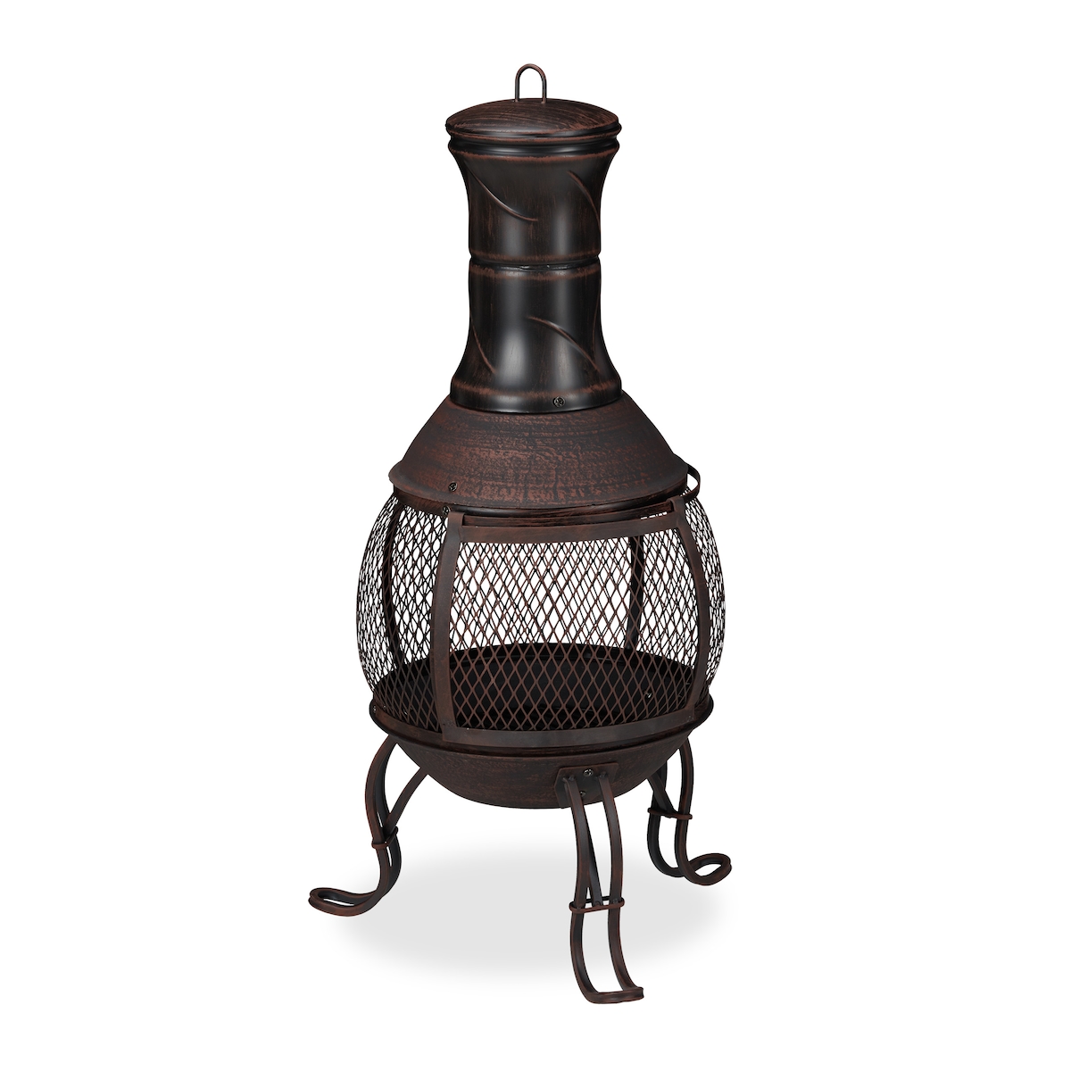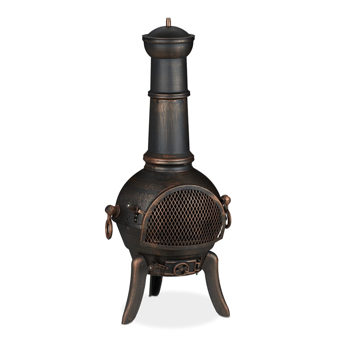 Relaxdays Terrassenofen, mit Funkenschutz, Schürhaken, Feuerrost, Zugluftklappe, Gartenkamin Gusseisen, Stahl, bronze