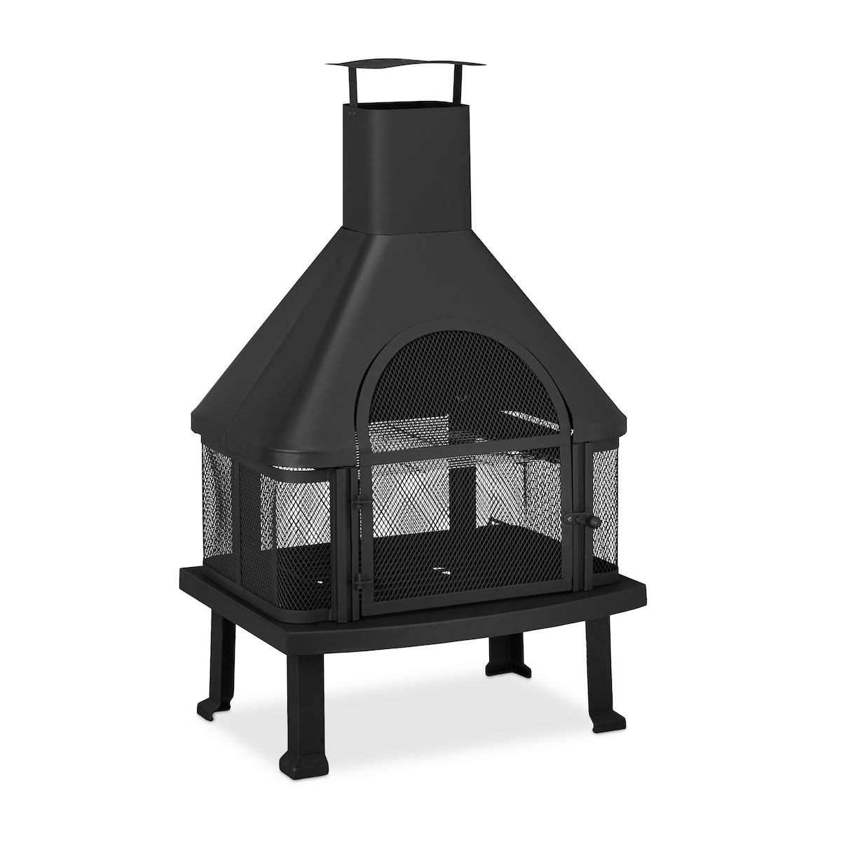 Relaxdays Terrassenofen mit Grill, Feuerstelle mit Funkenschutz, Schürhaken, massiv, Stahl, 110 x 63 x 51 cm, schwarz