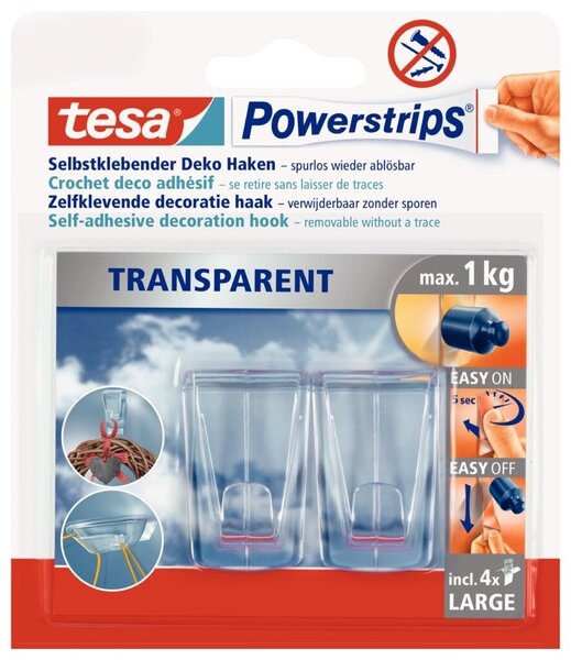 Tesa Powerstrips TRANSPARENT Deco-Haken LARGE, für max. 1 kg, Packung mit 2 Haken