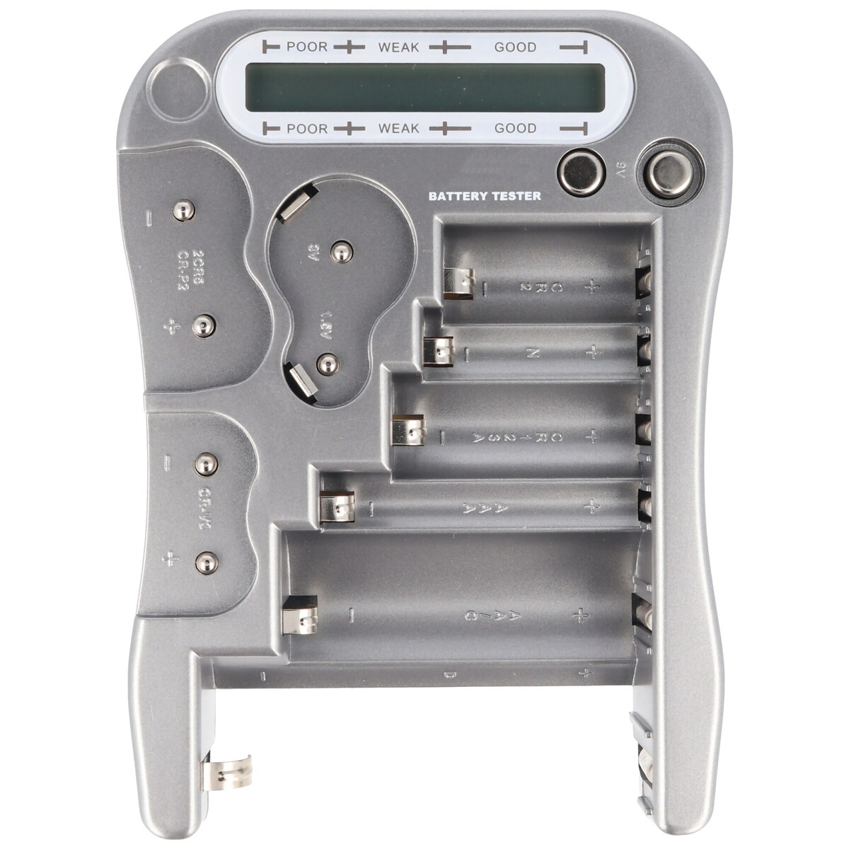 Batterie tester (aa)mignon-, (aaa)micro-, baby-, (d)mono-, Knopf- und 9-V-Zellen.