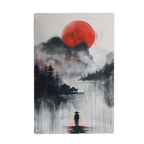 Holzbild "Chinese Ink Landscape" artboxONE - Natur,Reise,Menschen - Chinesisch,Ink,Tinte,Grau,Rot,Krieger,Landschaft,Natur,Berge,Ki