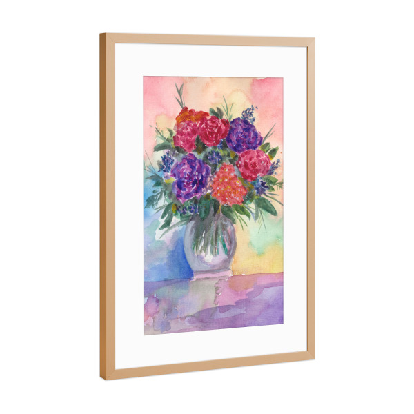 Poster mit Rahmen Kupfer "Rote und Lila Rosen" artboxONE - Floral - Rosen,Blumen,Pflanzen,Bouquet,Strauß,Blumenstrauß,Wasserfarben,Blüten,Vase,Tisch