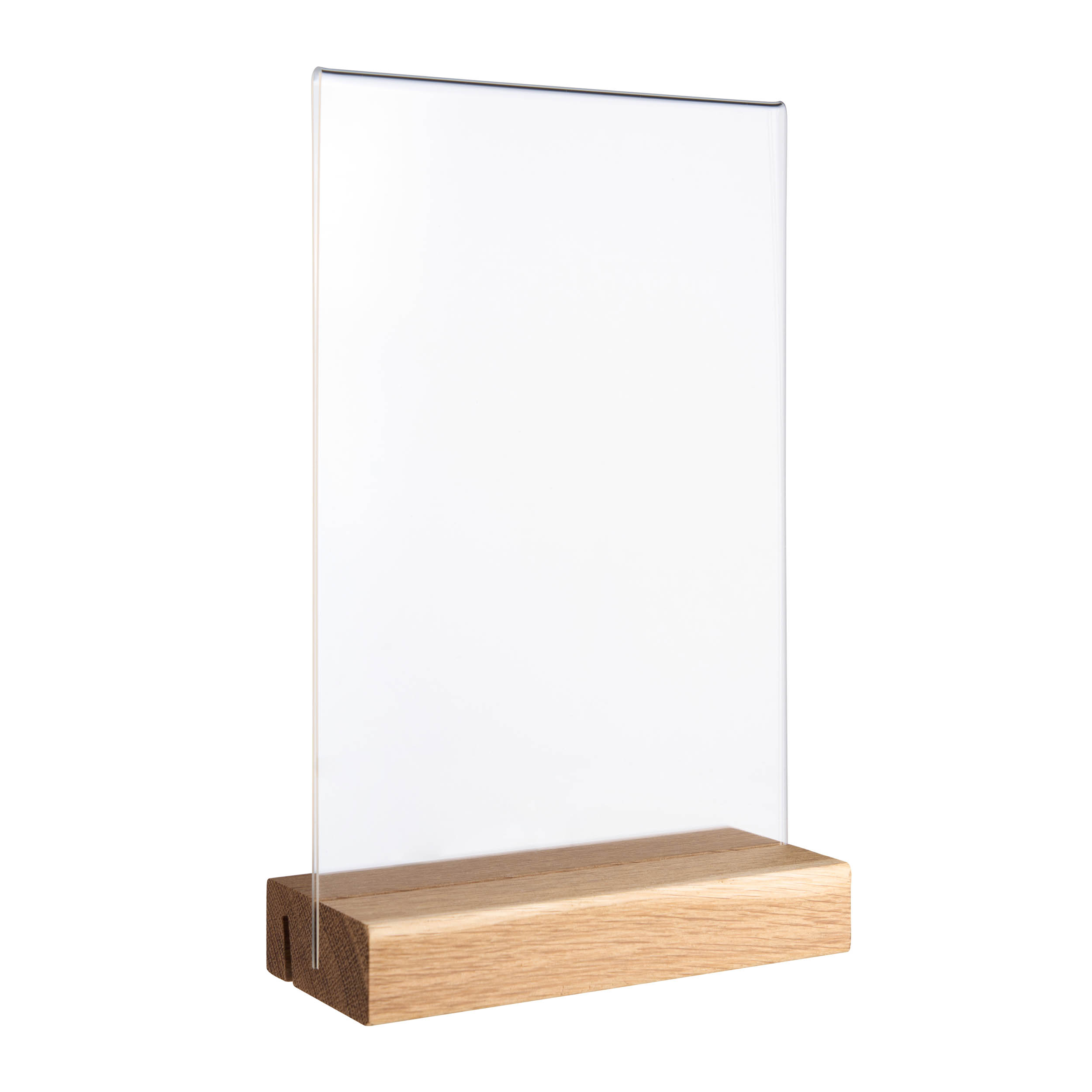 Tischaufsteller MODUL, Acrylglastasche mit Holzsockel A5 | Eiche | Holzsockel mit geradem und schrägem Einsteckschlitz, Eichenholz|Acryl (PMMA)
