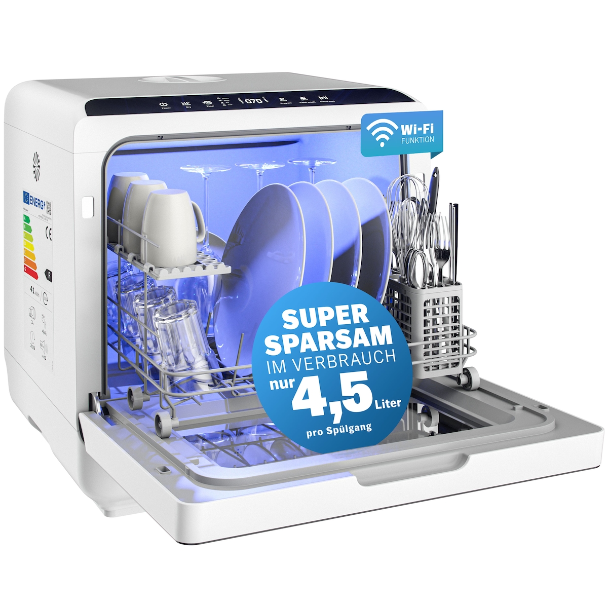BlitzHome BH-6-CDW1 Tragbare Tischspülmaschine mit APP-Steuerung, 5,2L Tank, 9 Programme, PTC-Heißlufttrocknung, 3D 360° Sprüher, EU-Stecker