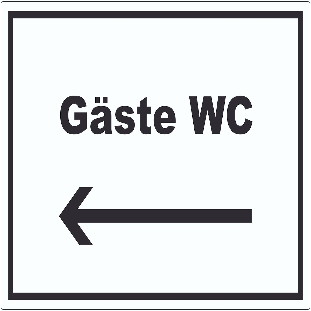 Gäste WC Schild mit Text und Richtungspfeil links Toilette waagerecht A4 Rückseite selbstklebend