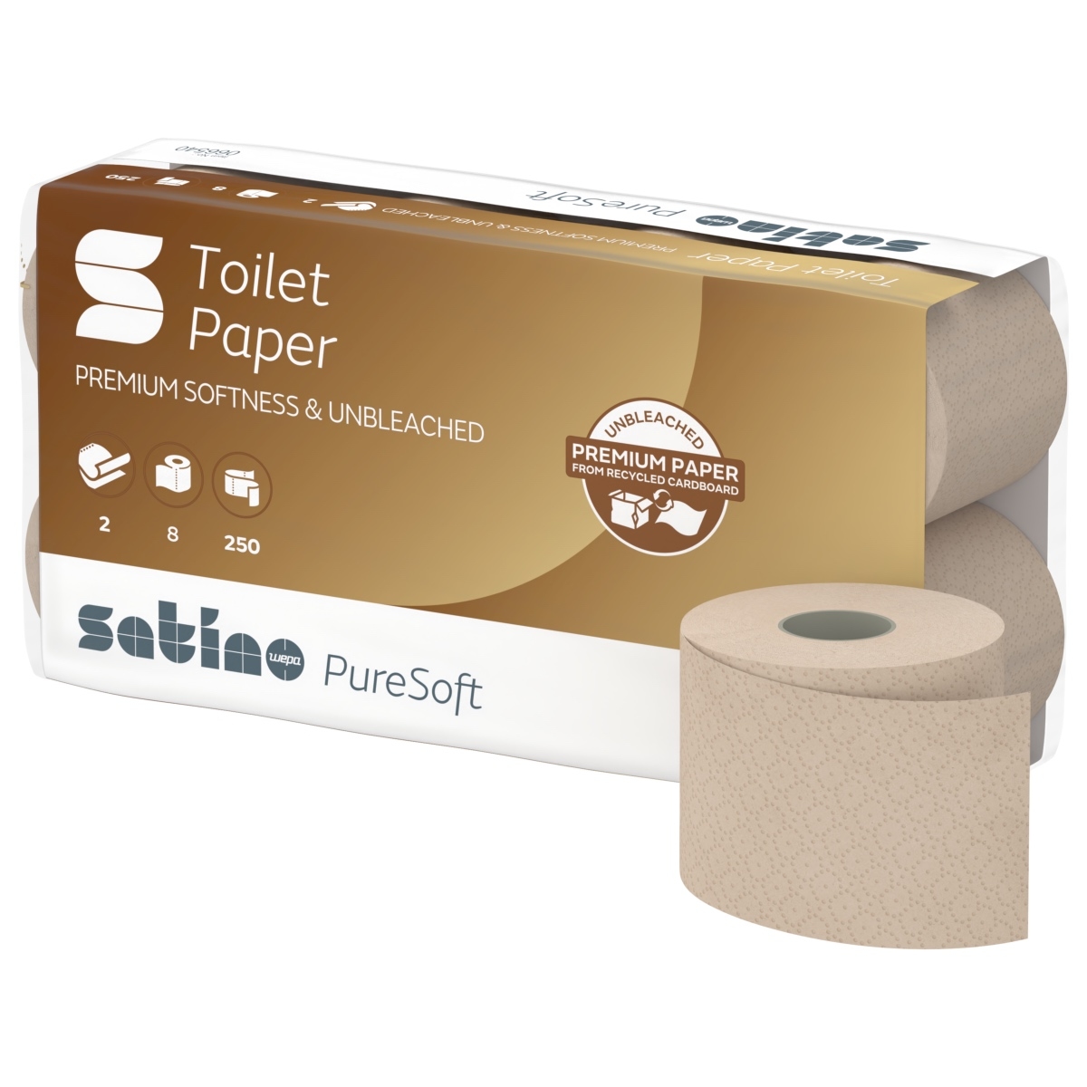 WEPA Professional Toilettenpapier Satino PureSoft, soft beige, 100 % Recycling, 2-lagig, 250 Blatt, 8x8=64 Rollen im Folienbeutel #066540