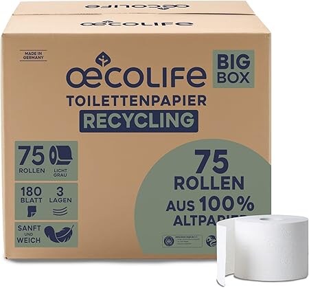 oecolife Toilettenpapier Box RECYCLING, 3-lagig, 75 Rollen x 180 Blatt, Großpackung, superweich, nachhaltiges Klopapier