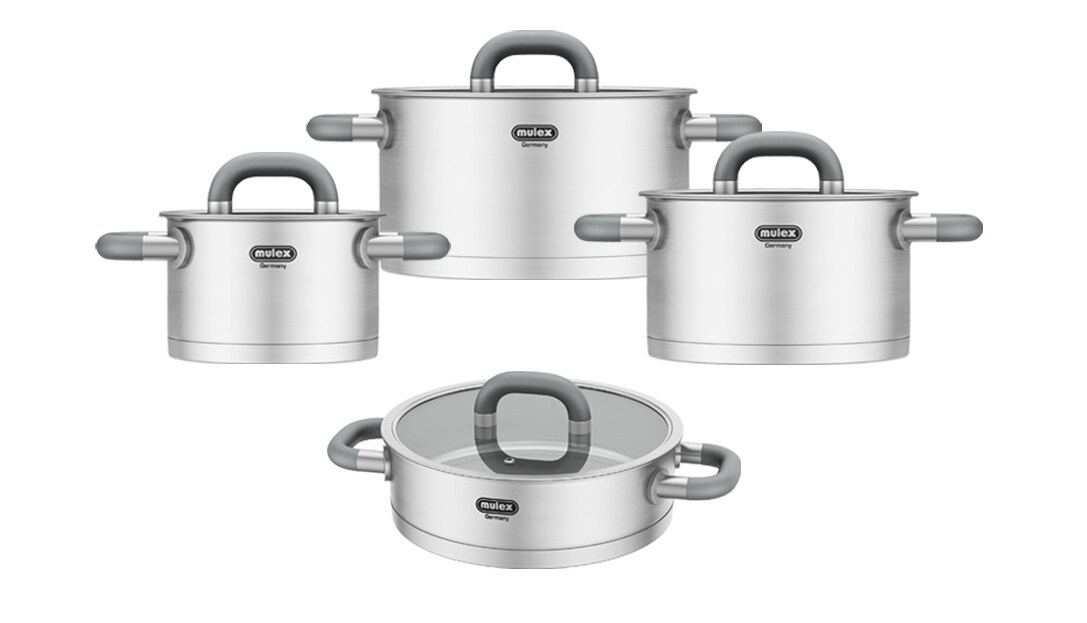 Mulex, Topfset LUGANO aus Edelstahl 6-teilig, + Servierpfanne, für alle Herdarten, mit Deckel, Induktions Töpfe Set