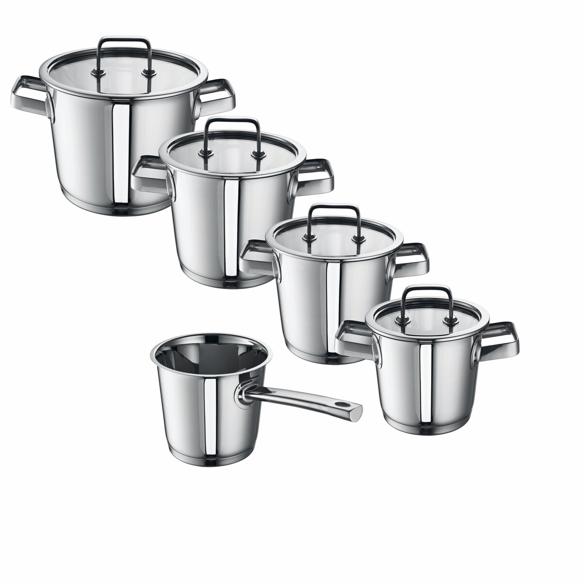 Kopf Topfset Merkur aus Edelstahl - Induktionstöpfe mit Schüttrand, Literskala und Glasdeckel – 6-teilig
