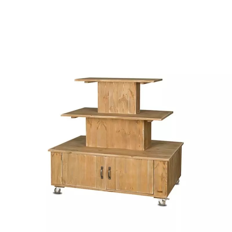 TRADIS Zentrales Display mit Rollen, 3 Ebenen, Massivholz