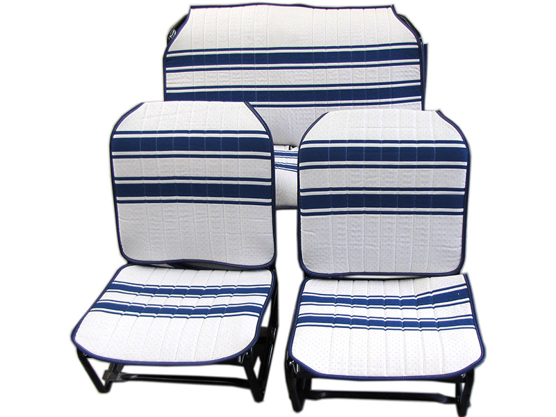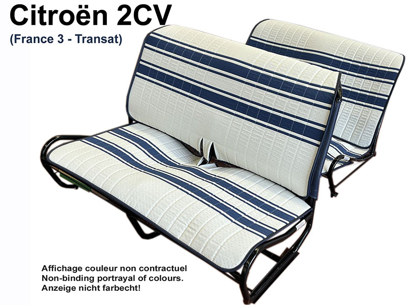 Sitzbezug 2CV (France 3 - Tranat) vorne + hinten. Symetrische Rückenlehne. Passend für Sondermodell France 3 (Transat). Weiß mit blauen Streifen