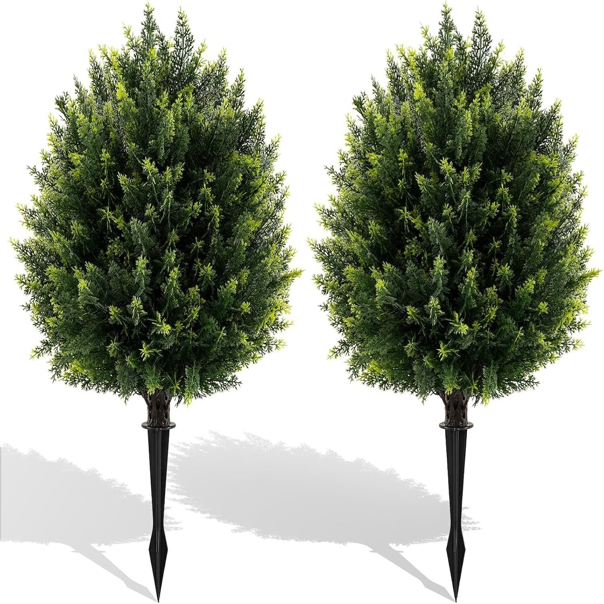 COSTWAY Set of 2 Artificial Plants, 61 cm, Cypress Ball Tree with Ground Spike, Cedar Artificial Tree with Pot