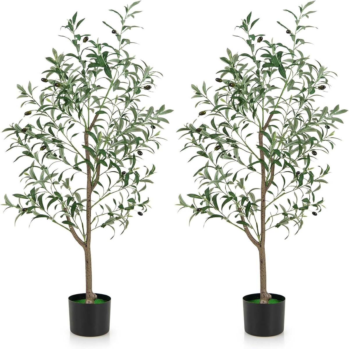COSTWAY Set of 2 Artificial Olive Trees, Artificial Plant 130 cm, Indoor Plant with Cement Pot & Natural Leaves & Fruits
