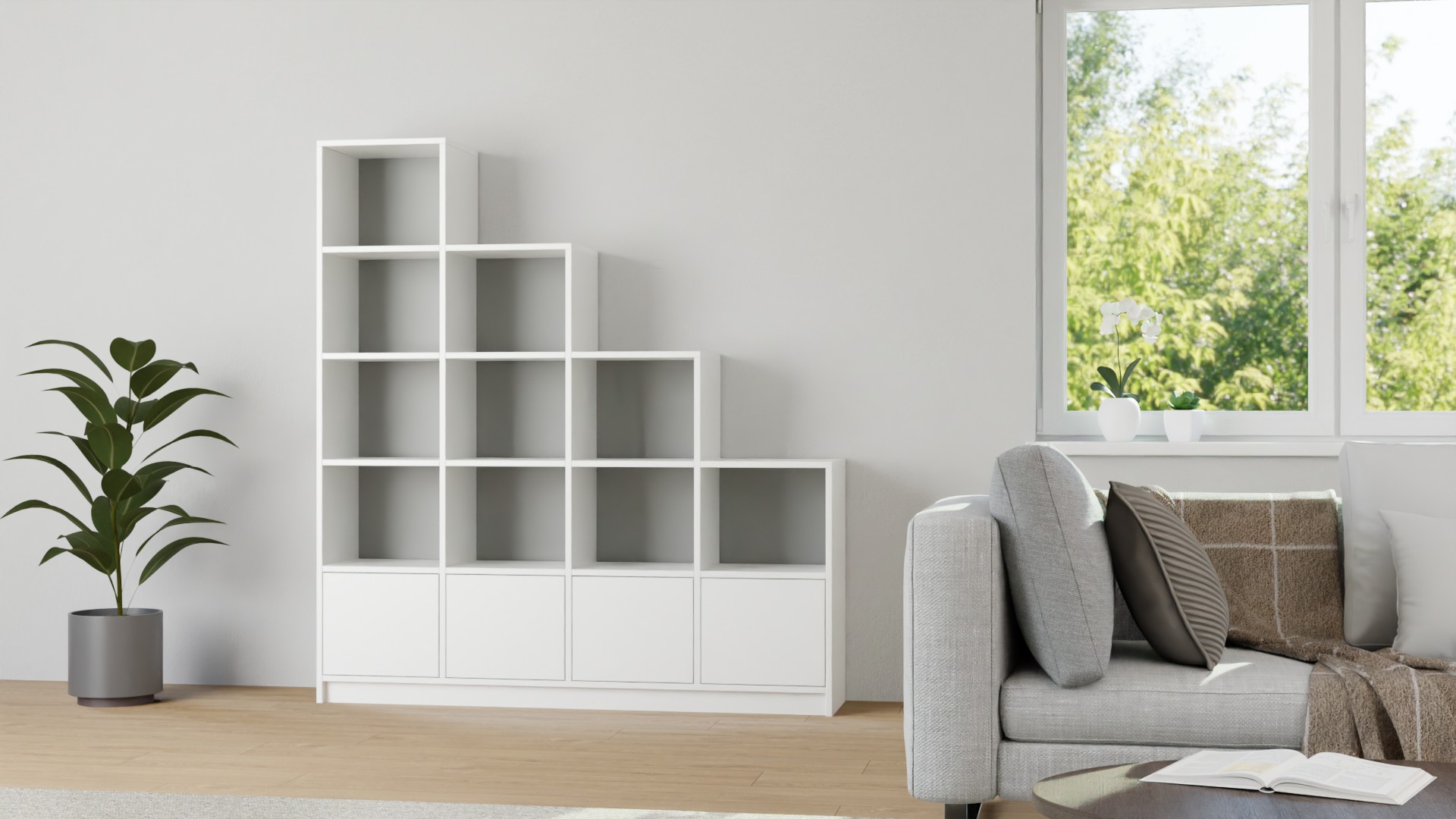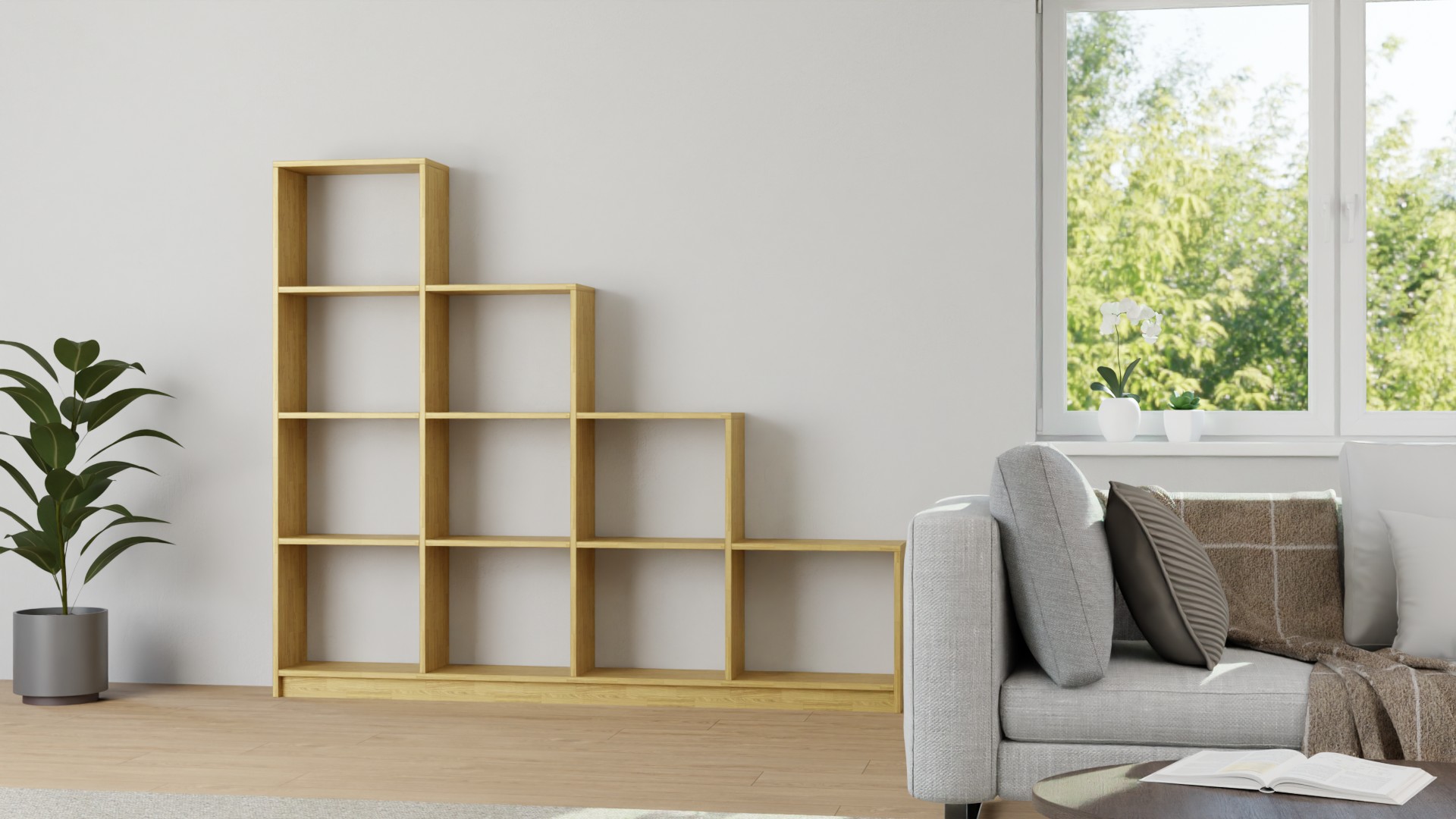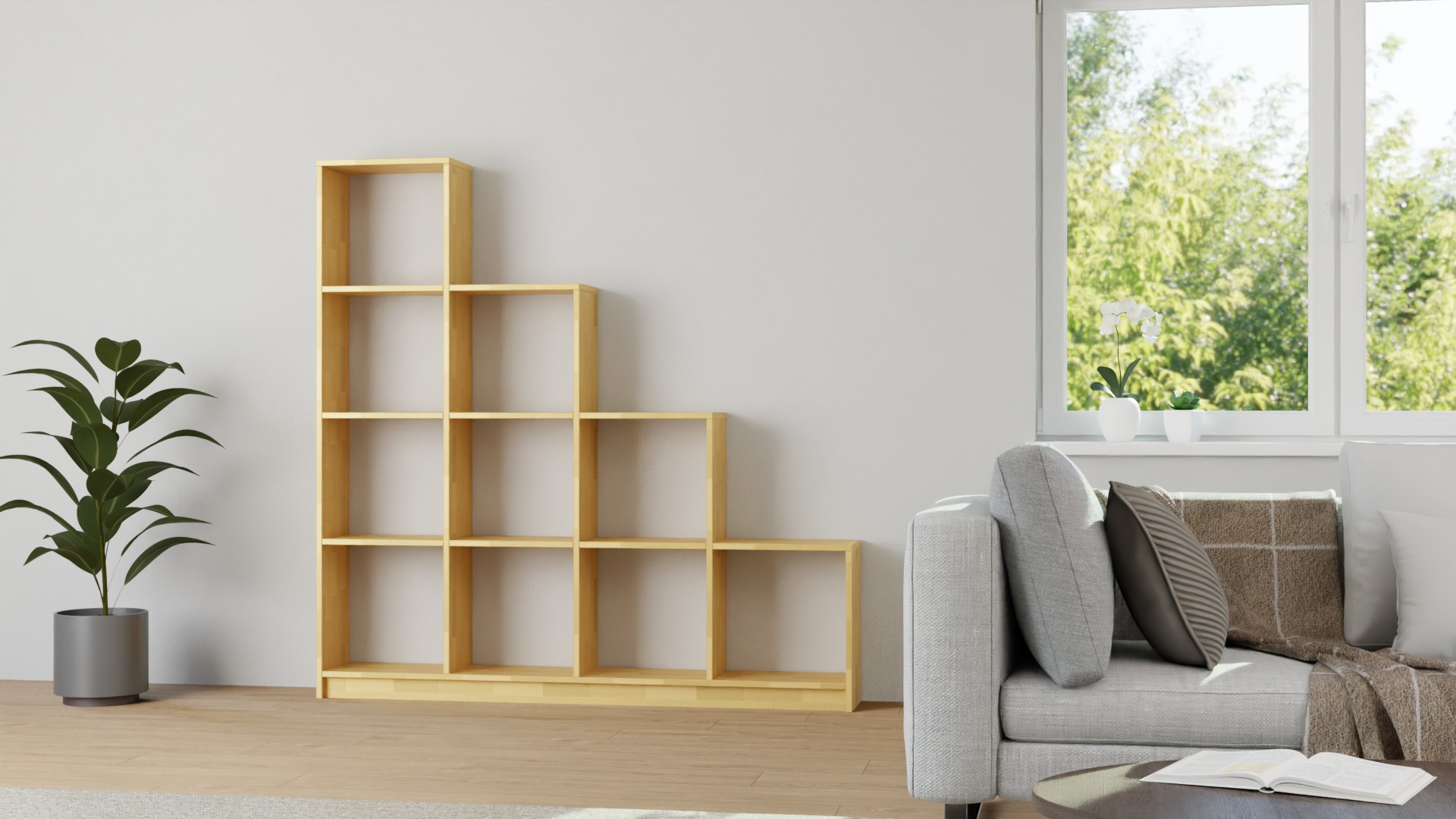 Treppenregal in Grau, 116,8 x 123,2 cm, als Raumteiler in treppenförmiger Ausführung