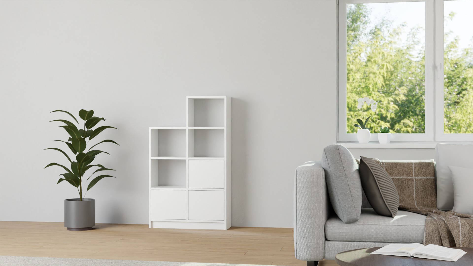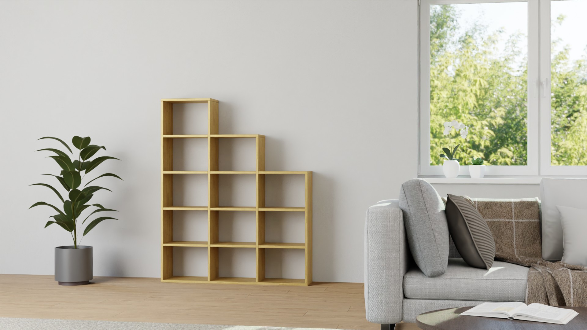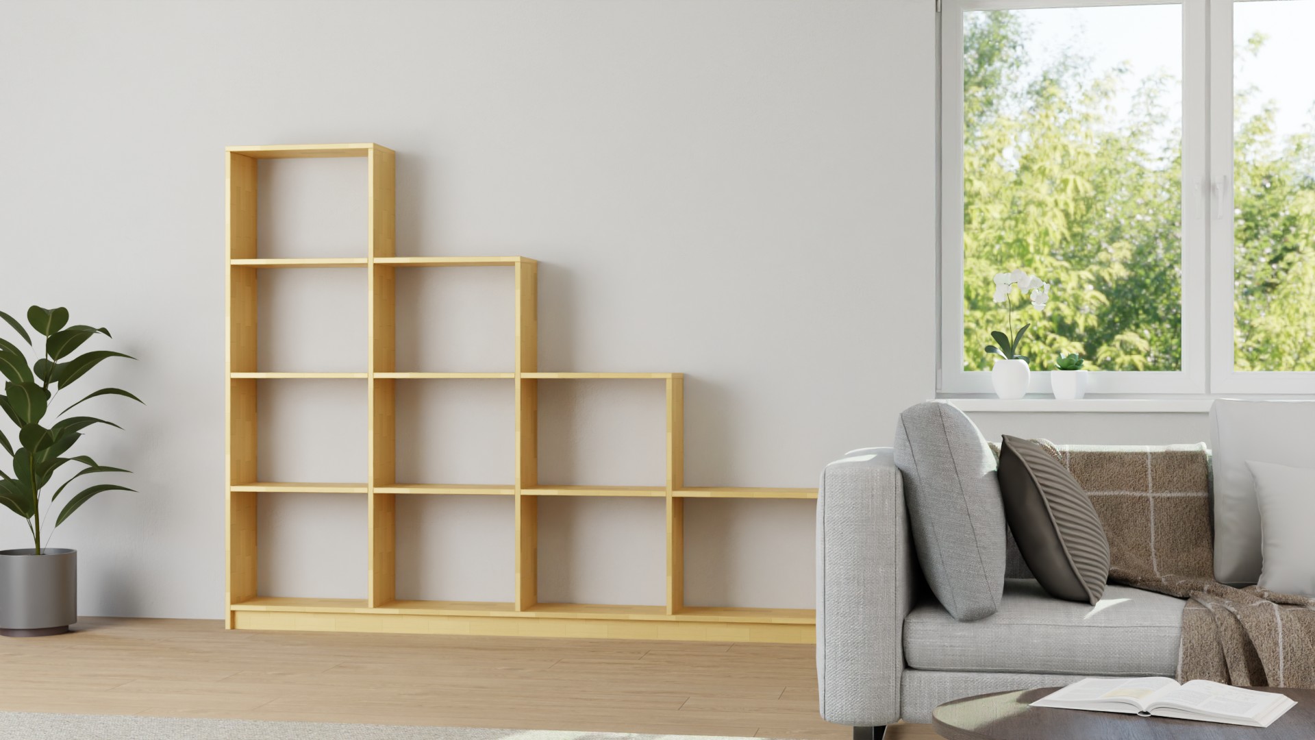 Treppenregal in Grau, 116,8 x 123,2 cm, als Raumteiler in treppenförmiger Ausführung