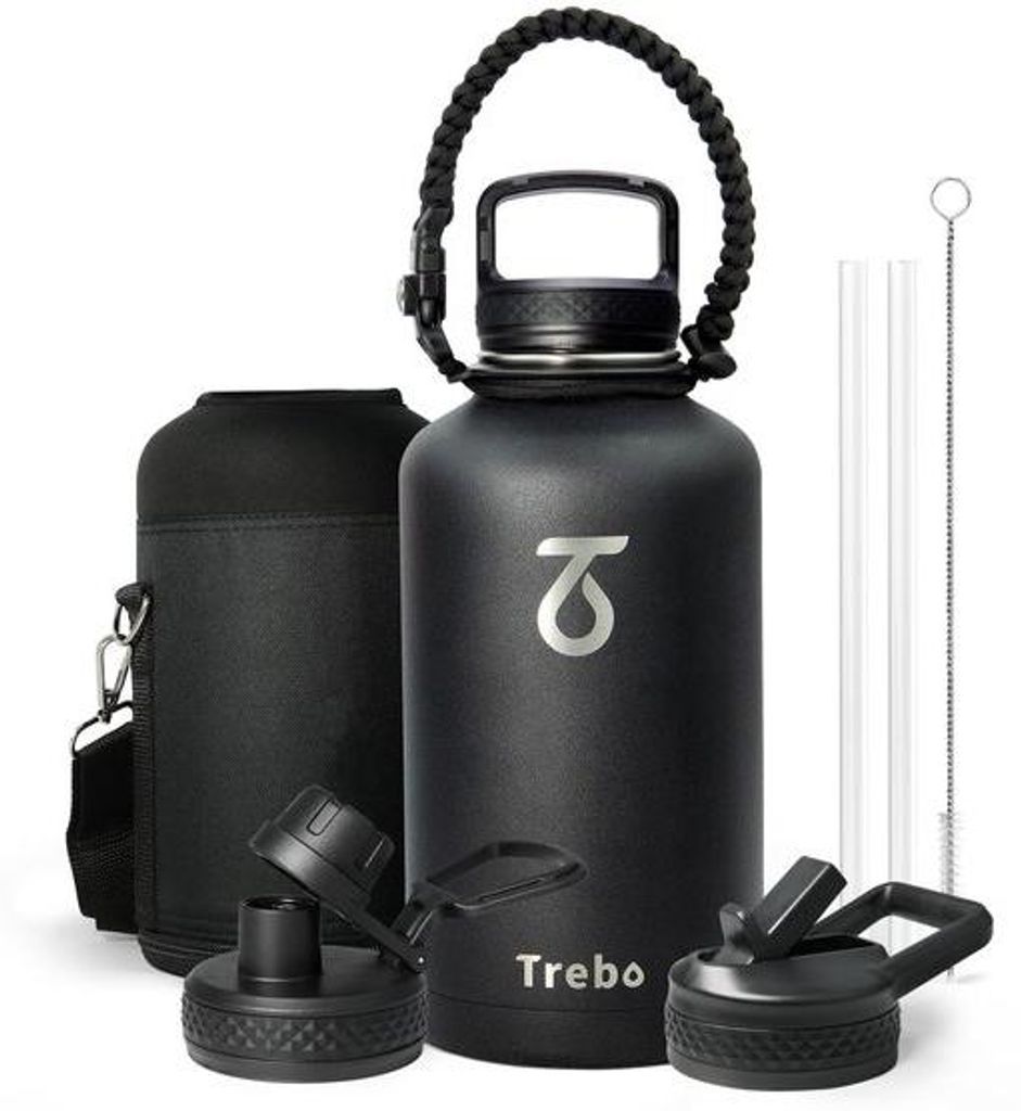 Thermosflasche mit Strohhalm, 2 l, Trebo Edelstahl-Trinkflasche mit Paracord-Griff und 3 Deckeln, Edelstahl-Trinkflasche mit breiter Öffnung, gro...
