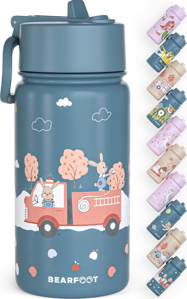 Trinkflasche Kinder Edelstahl mit Strohhalm, Thermosflasche 400ml - BPA frei, auslaufsicher, Kleinkinder, Mädchen & Jungen Wasserflasche - Bär blau